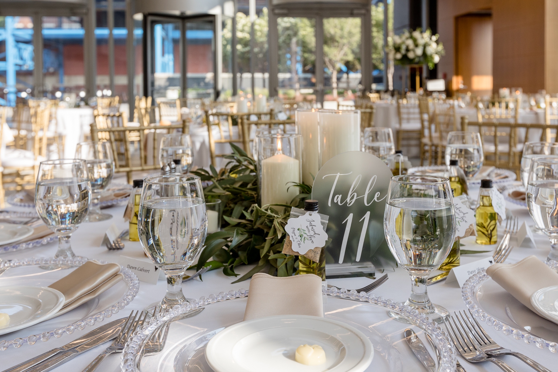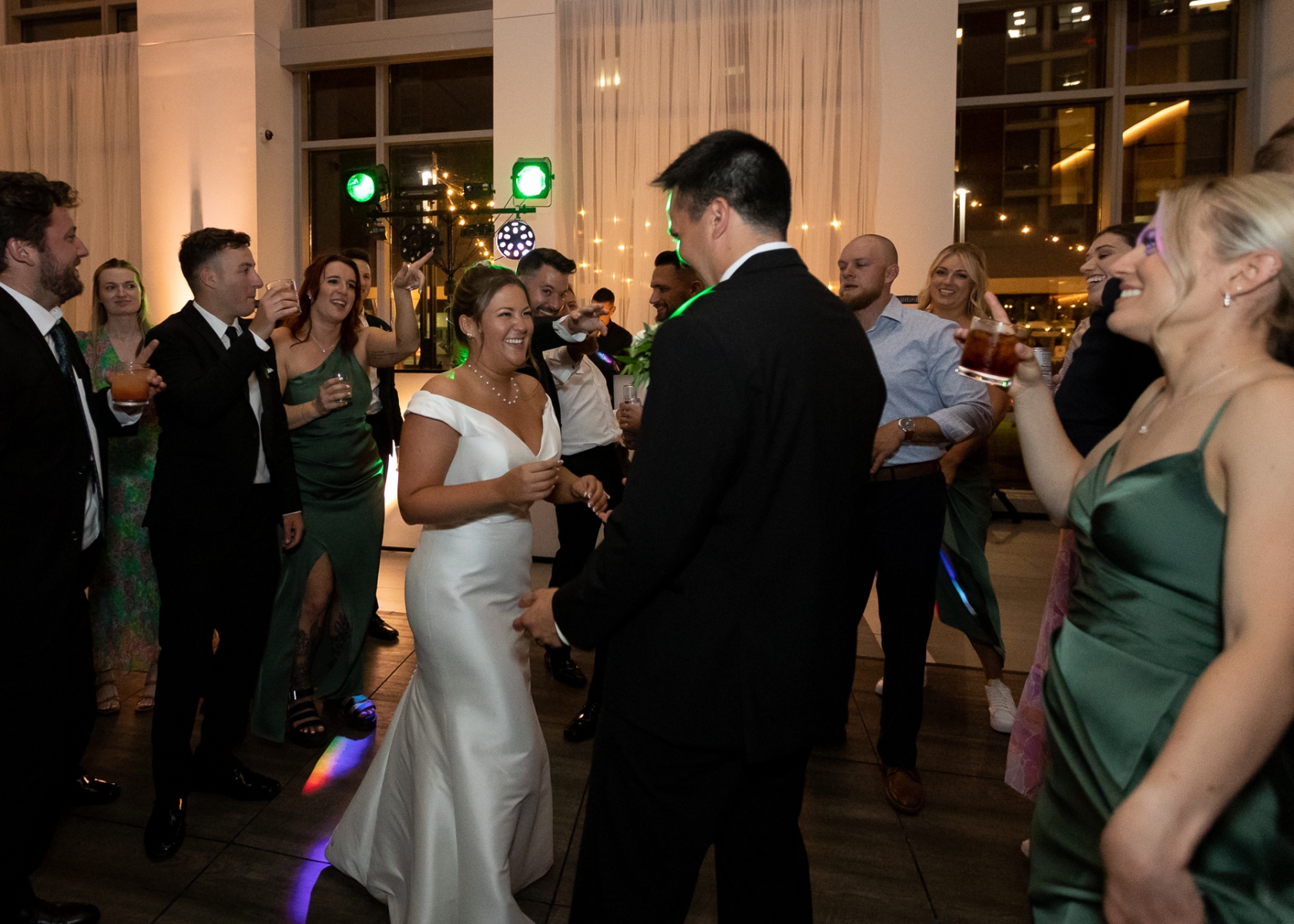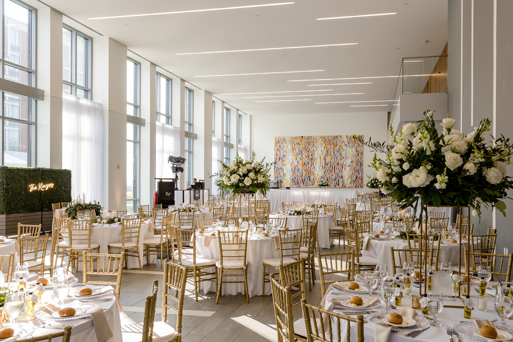 Megan & Chris’s gorgeous wedding reception took place is the lobby of the Ernst & Young building in The Flats. Upon arrival, guests were greeted with a glass of champagne as they made their way to the penthouse for cocktail hour. The room was absolutely stunning with gold and ivory accents. The staff is always accommodating and the food was outstanding as always. After dinner, the real party started. It was non-stop dancing until the very end and that’s just the way we like it!! Congrats Megan & Chris!!