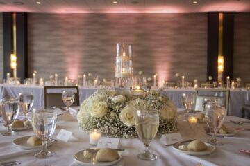 Rebekah & Joseph chose Ariel International Event Center for their reception. A unique warehouse venue with a perfect view of the lake made for a perfect evening to celebrate the happy couple. Guests enjoyed signature cocktails and a wonderful dinner provided by Taste of Excellence. The evening continued with Rebekah and Joseph hitting the dance floor with their friends and family as the sun set over the lake.