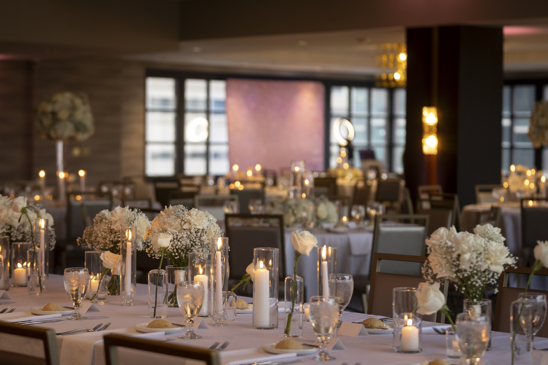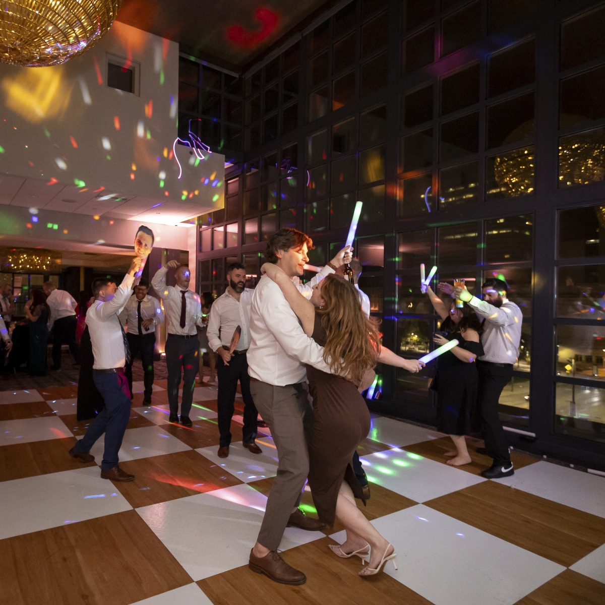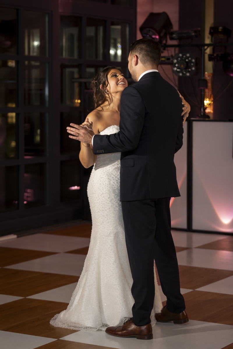 Danny & Alyssa’s wedding at the stunning St. Clair Ballroom was nothing short of unforgettable. With floor-to-ceiling windows overlooking downtown Cleveland, the space radiated elegance from the moment guests arrived. White florals filled the room, beautifully accented by soft pink uplighting—and just when you thought it couldn’t get any more stylish, a few disco balls added that perfect touch of fun and sparkle.